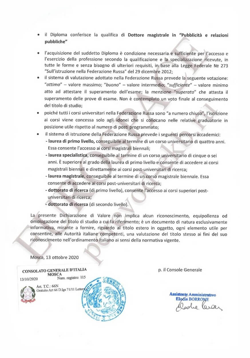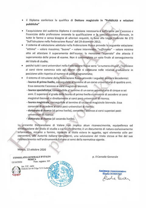 Это особый документ, который обязательно должен быть предъявлен наряду с российскими образовательными документами для поступления в Высшее учебное заведение на территории Итальянской Республики. К сожалению, без данного документа поступление в государственные и большинство частных ВУЗов Италии не представляется возможным.