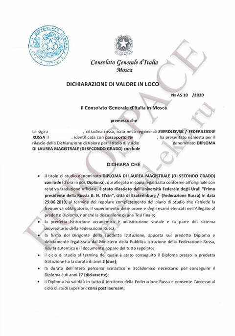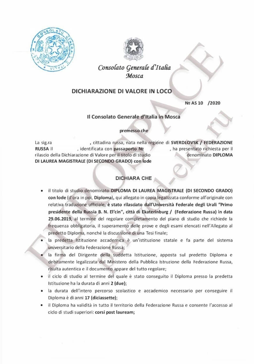 Dichiarazione di valore выдается посольством Италии, расположенным в Москве. Dichiarazione di valore оформляется в течение 14 календарных дней.
