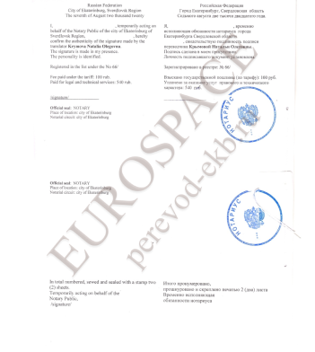 Процедура заверения перевода может быть осуществлена любым нотариусом, у которого наши специалисты зарегистрированы в качестве переводчиков. Мы работаем с более чем 30 нотариусами по г. Москвау и городам Свердловской области, поэтому у Вас всегда есть возможность самостоятельно заверить перевод у ближайшего нотариуса, либо заказать данную услугу в нашем бюро.